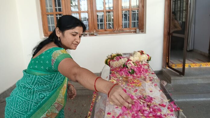 కరీంనగర్, నిఘా న్యూస్,:ఈరోజు ఉదయం అనారోగ్యంతో మృతి చెందిన కరీంనగర్ ఎమ్మెల్యే గంగుల కమలాకర్ మాతృమూర్తి గంగుల.నర్సమ్మ భౌతిక కాయానికి పూల మాల వేసి ఘనంగా నివాళులు అర్పించిన.18వ డివిజన్ కార్పోరేటర్ సుధగోని.మాధవి-కృష్ణగౌడ్ కరీంనగర్ లోని క్రిస్టియన్ కాలనీలో ఈ రోజు ఉదయం మాజీ మంత్రి,ప్రస్తుత ఎమ్మెల్యే గంగుల కమలాకర్ మాతృమూర్తి గంగుల నర్సమ్మ అనారోగ్యంతో మృతి చెందారు.గంగుల నర్సమ్మ మరణం పట్ల గంగుల కమలాకర్ కుటుంబ సభ్యులను పరామర్శించి ప్రగాఢ సానుభూతిని వ్యక్తం చేశారు. నర్సమ్మ ఆత్మకు శాంతి చేకూరాలని కోరుకున్నారు..