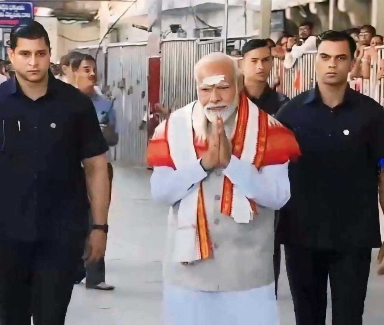 వేములవాడ, నిఘా న్యూస్: ఎన్నికలప్రచారంలో భాగంగా రాజన్న సిరిసిల్ల జిల్ల వేములవాడలో పర్యటించారు ప్రధాని. వేములవాడలో హెలిక్యాప్టర్ దిగిన తరువాత నేరుగా రాజన్న క్షేత్రానికి చేరుకున్న ఆయన కోడె మొక్కు చెల్లించుకున్నారు. గర్భాలయంలో స్వామి వారికి ప్రత్యేక పూజలు చేశారు. ఈ సందర్భంగా వేద పండితులు ప్రధానికి ఆశీర్వచనాలు అందజేశారు.దక్షిణ కాశీగా భాసిల్లుతున్న వేములవాడ శ్రీ రాజరాజేశ్వర స్వామిని ఓ ప్రధాని దర్శించుకోవడం ఇదే ప్రథమం. చాళుక్యల రాజధానిగా కూడా వెలుగొందిన రాజన్న క్షేత్రానికి ఎన్నో ప్రత్యేకతలు ఉన్నాయి. చారిత్రాత్మక నేపథ్యం ఉన్న ఈ ఆలయాన్ని ఎంతో మంది పండితులు, పీఠాధిపతులు, ప్రముఖులు దర్శించుకున్నారు. కానీ ప్రధాని హోదాలో ఉన్న వారు దర్శించుకోలేదు. ఆ రికార్డును ఒక్క నరేంద్ర మోడికి మాత్రమే దక్కింది.గర్భాలయం వద్దకు చేరుకున్న ప్రధాని మోడీ ప్రదక్షిణలు చేస్తుండగా క్యూ లైన్లలో ఉన్న భక్తుల నినాదాలో దద్దరిల్లి పోయింది. శ్రీరామ్, శ్రీరామ్ అంటూ భక్తులు ఇచ్చిన నినాదాలతో బారీగేట్ల సమీపం వరకు చేరుకున్న ప్రధాని వారికి అభివాదం చేస్తూ ప్రదక్షిణలు చేశారు.