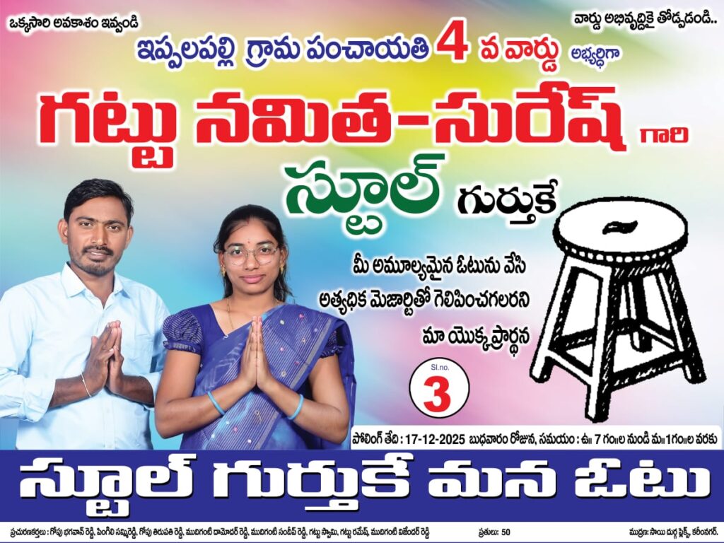 ఇప్పలపల్లి గ్రామం అభివృద్ధి చెందాలంటే నిజాయితీగల ప్రతినిధులు అవసరం.. సమస్య వచ్చినప్పుడు స్పందించే వారు, ప్రజల మధ్యే ఉండి పరిష్కారం చూపించే వారు కావాలి.. ఆ నమ్మకాన్ని మేము నిలబెడతామని అంటున్నారు. ప్రతి సమస్యపై వెంటనే చర్యలు తీసుకుంటామని హామీ ఇస్తున్నారు.మన వార్డు భవిష్యత్తు మన చేతుల్లోనే ఉంది. అభివృద్ధి, ఐక్యత, పారదర్శక పాలన కోసం సరైన నిర్ణయం తీసుకునే సమయం ఇది. ఇప్పలపల్లి గ్రామం 4వ వార్డు అభ్యర్థులు గట్టు నమిత–సురేష్‌లను భారీ మెజార్టీతో గెలిపించండి అని కోరుతున్నారు.